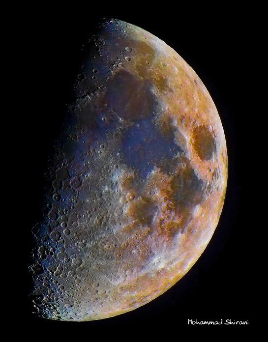 At first glance, the moon looks remarkably gray. There are light-gray lunar highlands, dark-gray lunar seas, and miles and miles of gray moondust everywhere. Not so fast! Astronomers have long known that the moon's terrain is actually rich in subtle color. What do these colors mean? Blue denotes areas rich in titanium, while orange is titanium poor. Pink traces iron-poor, aluminum-rich feldspars found in the lunar highlands.