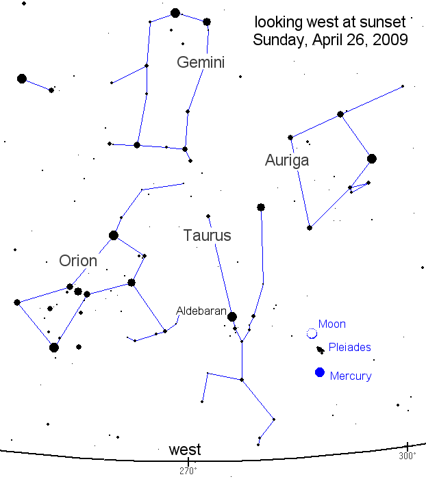 As dusk deepens into darkness, see if you can spot the dipper-shaped Pleaides cluster between the Moon and Mercury.
